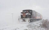 今期も、やっと?ついに?まとまった降雪。地吹雪の中を走る津軽鉄道はストーブ列車で有名だが、このオレンジ色の車両は「メロス号」(と、それ目当ての撮り鉄)。